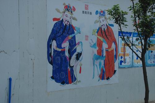 綿竹是我國的年畫之鄉,綿竹年畫與天津楊柳青、江蘇桃花塢、山東濰坊并稱四大年畫。貼年畫、畫年畫是綿竹人民風俗。景觀大道2號立交橋板房安置區,有板房約2萬間,這里安置的都是綿竹市區房屋受損的居民,最多時達5萬人,是汶川地震后最大的一個板房區。在這里,不僅能看到整齊的街道,旺長的花草,還有街道兩旁墻壁上貼著的鮮活年畫,年畫或講民間故事、或是歷史傳說,人物栩栩如生、身姿形態各異,個個飽含笑意,讓人遠遠地就感受到一股暖春的氣息……