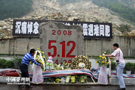 兩岸媒體記者在北川縣城內的“5·12”紀念碑石前敬獻花籃,悼念遇難同胞。(中國臺灣網 鐘寶華 攝)