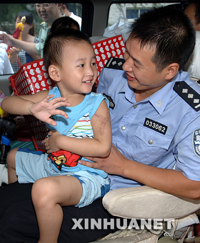 郞錚的父親郎洪東是北川縣一名公安民警,警齡已有13年。郎洪東說,原來的家在地震中毀掉了,他在綿陽租了一套房子。郞錚出院后將回到綿陽,回歸正常的家庭生活。 |