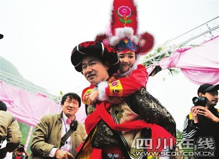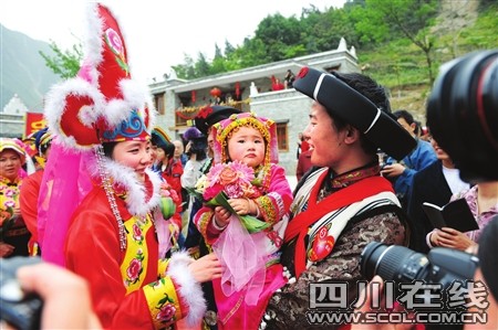 4歲的趙水銘穿著一身新嶄嶄的羌族童裝,走在吉娜羌寨廣場上很惹眼。清早7點,還沒睡醒的她就被外婆叫起來,從綿陽市區(qū)趕來這里。“你來干什么啊?”“吃喜酒。”“吃誰的喜酒?”“爸爸的。”“爸爸叫什么?”“趙欽。”依偎在外婆陳國云的身旁,小水銘面對鏡頭有些害羞。“爸爸他今天身邊會有一個阿姨陪著,你認得到嗎?”“認得到。”“你喊她什么?”“三媽。”“三媽好嗎?”“好。”小水銘點頭。外婆俯下身子,給小水銘整理被她弄歪的帽子,教她回答:“給記者叔叔說,三媽給水銘買零食,買玩具,買衣服,很好啊……”說這些話的時候,陳國云的眼中有淚光閃爍。她說,女兒遇難時還不到30歲,對女婿再婚,陳國云說她很高興,新娘子樸正英是北川人,十年前離異,大家知根知底。“她人很好,不錯的。”說這些話的時候,陳國云的眼眶再一次濕潤,閃動著淚花。