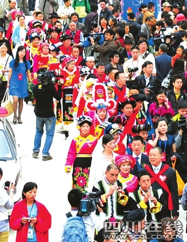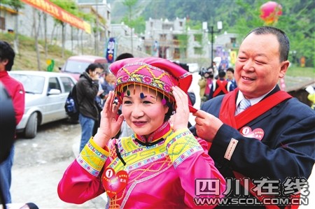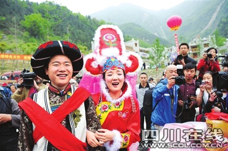 奔放的羊皮排鼓、迎客的朝天嗩吶、悠遠綿長的羌笛,還有那羌族姑娘小伙深情嘹亮的對歌……昨日上午11:30,新聳立起來的擂鼓鎮(zhèn)吉娜羌寨,家家戶戶掛起了成串的玉米、辣椒;紅綢纏繞起羊頭骨、白云石和羌俗彩旗。20對北川災(zāi)后重組家庭新人在這里舉行集體婚禮,醇香的土壇咂酒裝滿了一只只喜氣洋洋的老碗,噴香的壩壩喜宴圍滿了四山八嶺來的鄉(xiāng)親……眾人齊祝福:“祝福這些歷經(jīng)苦難的人們,愿他們的未來幸福安康!”