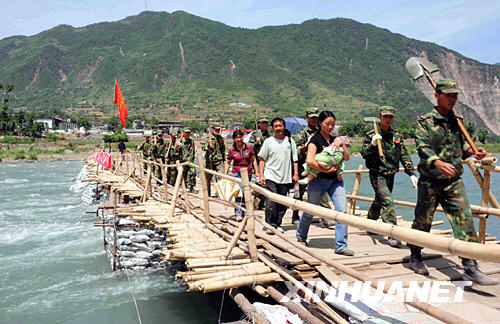 汶川大地震后,由于山體塌方、橋梁受損,四川平武縣南壩鎮(zhèn)成為一座“孤島”。前來救援的空軍某部官兵在缺乏建材和工具的涪江邊,用鐵絲、石袋、竹木等材料架起一座便橋,方便盡快救出傷員、運送救災物資。 新華社發(fā)(沈玲 攝)