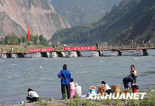 災區(qū)群眾在橋上掛上感謝解放軍的橫幅(6月2日攝)。
