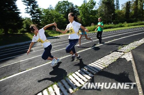8月3日,在俄羅斯南部黑海之濱圖阿普謝的“小鷹”全俄兒童中心,正在這里療養的四川地震災區學生與俄羅斯學生一起參加4×100米接力賽。當日,“小鷹”全俄兒童中心舉行運動會,中俄學生同場競技,一展風采。新華社記者沈伯韓攝