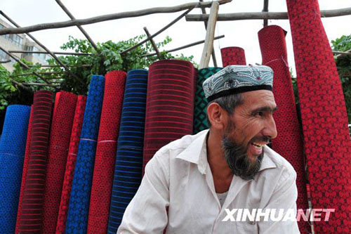 7月12日,阿布拉·買提尼亞孜在新疆阿克蘇市規模最大的托克遜巴扎上賣地毯。新華社記者 侯俊攝
