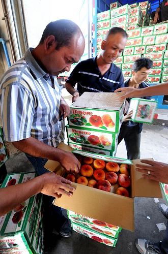 7月20日,工人在霍爾果斯競天國際客服中心為來自哈薩克斯坦的卡車裝車。進入夏季,新疆霍爾果斯口岸果蔬出口繼續保持較好的增長勢頭,每天往來口岸采購、運送果蔬的客商和物流車輛絡繹不絕。廣西的菠蘿、海南島的香蕉、山東的辣椒、陜西的蘋果以及新疆伊犁河谷出產的時鮮蔬菜經霍爾果斯口岸源源不斷地進入中西亞各國。據了解,2008年以來通過該口岸銷售到中亞國家的蔬菜、果品接近20萬噸,其中90%以上來自內地。霍爾果斯口岸已成為我國西部重要的果蔬出口重要通道。 新華社記者 李紫恒 攝