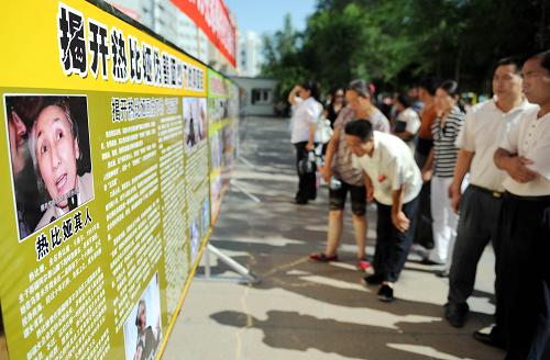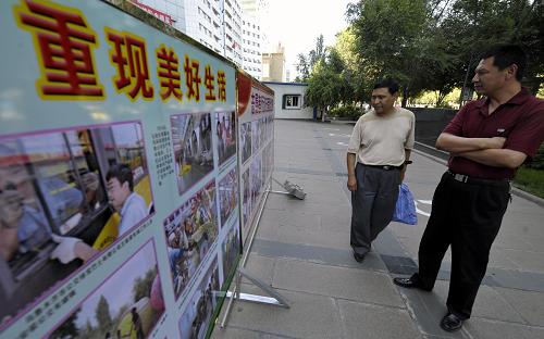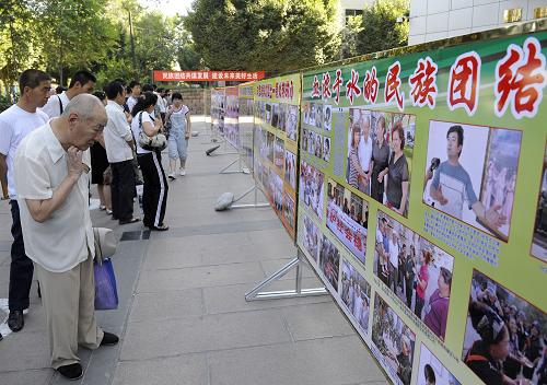 7月21日,市民在烏魯木齊市圖書館前觀看圖片展。當日,由烏魯木齊市委宣傳部、文化局主辦的新疆維吾爾自治區烏魯木齊市打砸搶燒嚴重暴力犯罪事件紀實圖片展在烏魯木齊市圖書館前展出,300余幅圖片真實地再現了烏魯木齊“7·5”事件發生、處置、善后全過程。從22日起,該圖片展還將進入部隊、社區、學校、鄉鎮等地巡展。新華社記者王菲 攝