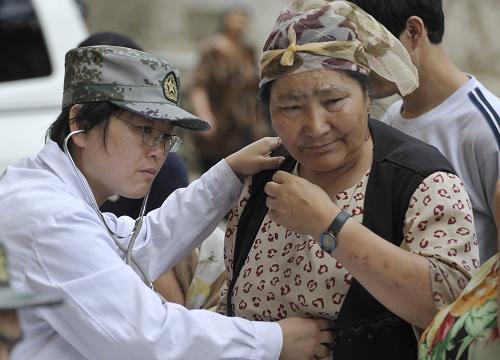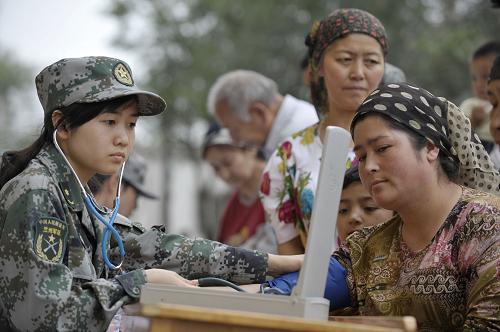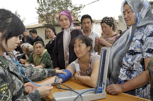 7月23日,解放軍第二十三醫(yī)院醫(yī)務人員為烏魯木齊八戶梁社區(qū)一位居民量血壓。當日,解放軍第二十三醫(yī)院醫(yī)務人員來到烏魯木齊八戶梁社區(qū)開展義診活動,社區(qū)內(nèi)上百位各族居民前來問診,軍醫(yī)們還為當?shù)刭浰土艘恍┏S盟幤贰P氯A社記者 趙戈 攝