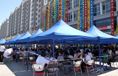 7月25日,市民們在新開盤小區外的涼棚下,等待選購新房。位于烏魯木齊市高新開發區的一家房地產公司新建的小區剛剛開盤,周末就迎來了大批購房者前來排隊選購,據介紹,僅7月25日一天,前來排隊購房者就超過1000多人。新華社記者 沈橋 攝