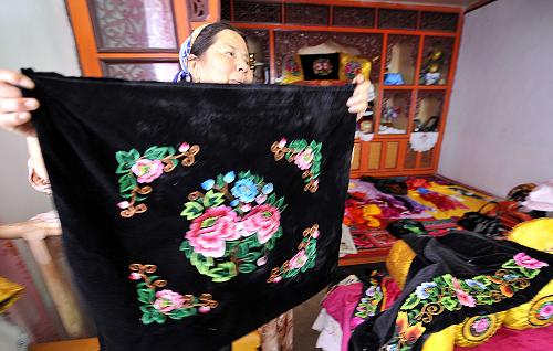 阿加汗·賽買提展示她的民族刺繡作品(7月31日攝)。現(xiàn)年57歲的阿加汗·賽買提是有“中國民間文化藝術(shù)之鄉(xiāng)”之稱的新疆哈密市回城鄉(xiāng)維吾爾族農(nóng)民,她是當(dāng)?shù)赜忻霓r(nóng)民畫家和剪紙藝術(shù)家,更是名揚鄉(xiāng)里的民族手工藝刺繡能手。她的民族手工藝刺繡作品受到眾多維吾爾族群眾喜愛,年輕人結(jié)婚會整套訂制。看到商機的阿加汗·賽買提將自己的手藝傳給3個女兒,購置了專業(yè)設(shè)備,開辦起家庭式的民族刺繡加工廠。如今,她加工的民族繡品不僅銷往新疆各地,還有日本客商前來訂貨,一年能給這個家庭帶來4萬多元的收入。新華社記者 沈橋 攝