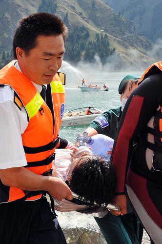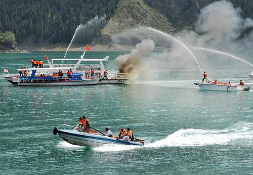 8月4日,救援船只在演習中滅火并轉移“游客”。當日,新疆最大規模的水上安全應急演習在天山天池舉行。演習模擬兩艘游船相撞引發起火,有數名游客落水。救援部門接到報警后,迅速出動船只,展開水上搜救。共有近百名相關人員參與演習,出動各類船艇10艘。 新華社發(江文耀 攝)