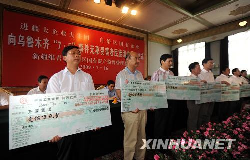 16日,神華集團、中糧集團、寶鋼集團等33家中央及外省(區(qū)、市)駐疆國有企業(yè)和中泰化學、中國移動新疆公司、新疆有色集團等33家自治區(qū)國有企業(yè)的代表齊聚烏魯木齊昆侖賓館,向“7·5”事件受害者和財產(chǎn)受損失的群眾捐款。其中,神華集團捐款5050萬元,中糧集團捐款2000萬元,寶鋼集團、中國保利集團、國家電網(wǎng)公司和國家開發(fā)投資公司等6家中央駐疆國有企業(yè)捐款在1000萬元以上。