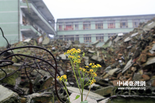 在地震遺址,處處都可見到這樣的黃色小花在廢墟上頑強地生長著。(中國臺灣網 田云鵬 攝)