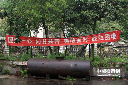 在廢墟中一片比較開闊的地帶,一條橫幅宣示著廠區職工和家屬抗震救災的決心和信心。(中國臺灣網 田云鵬 攝)