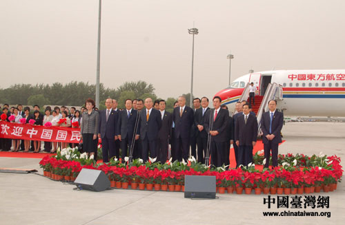 中國國民黨大陸訪問團一行,27日下午抵達(dá)北京首都機場。中臺辦主任陳云林及北京市委副書記王安順前往迎接。圖為歡迎儀式現(xiàn)場。中國臺灣網(wǎng)記者田云鵬攝