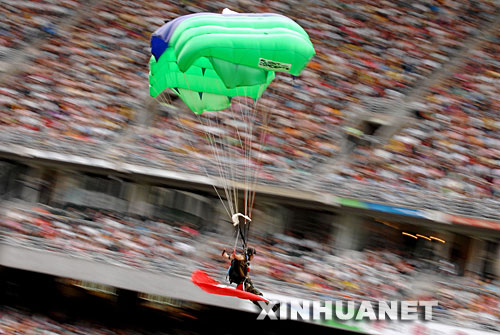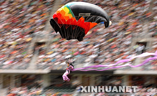 7月2日,解放軍八一跳傘隊隊員在表演。當(dāng)日,“雄鷹翱翔慶回歸”――解放軍八一跳傘隊表演在香港大球場舉行。新華社記者 呂小煒攝