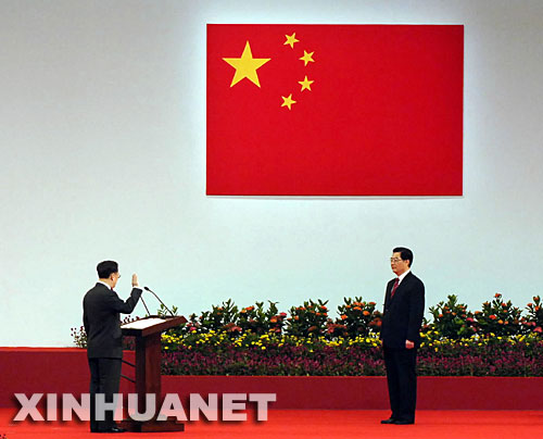 7月1日,慶祝香港回歸祖國(guó)十周年大會(huì)暨香港特別行政區(qū)第三屆政府就職典禮在香港會(huì)展中心舉行。這是香港特區(qū)第三任行政長(zhǎng)官曾蔭權(quán)面對(duì)胡錦濤主席,舉起右手莊嚴(yán)宣誓。 新華社記者公磊攝