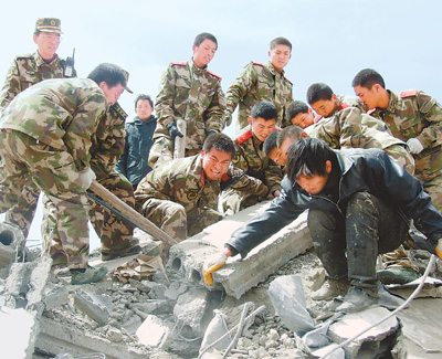 武警青海總隊(duì)玉樹支隊(duì)官兵在尋找幸存人員。于文群攝