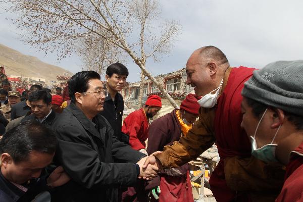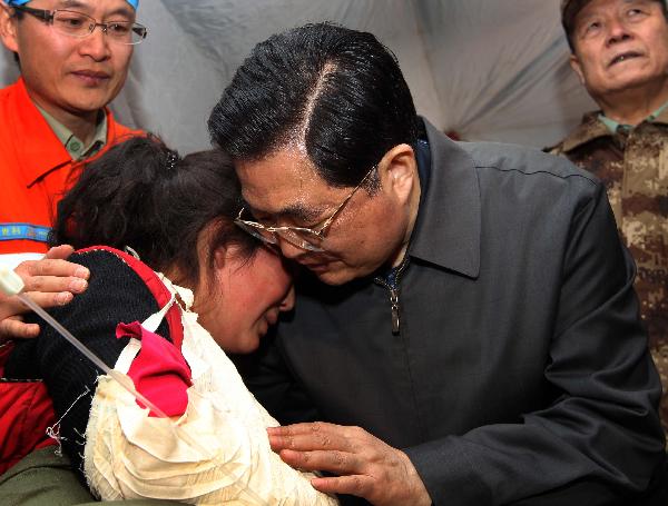 4月18日,中共中央總書記、國家主席、中央軍委主席胡錦濤親切慰問受災群眾(4月18日攝)。 新華社記者蘭紅光攝