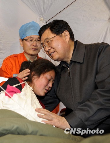 下午1時許,胡錦濤又驅車來到玉樹州體育場,看望正在接受治療的傷病員,了解傷員救治、藥械保障及疫病防控情況,并與傷員親切交談。玉樹州體育場是地震后設立的臨時醫療救助點。