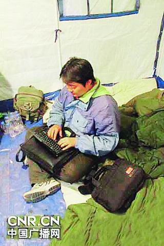 文化新聞版主編丁偉是人民日報此次抗震救災報道的前方負責人,他說:“總社要求記者敞開口子寫,我們的壓力特別大,到凌晨記者的帳篷都是亮著燈的。昨天才有電,剛來的兩天沒電,我們都是點蠟燭寫稿!