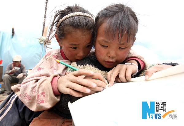 4月21日,俄德才仁的女兒成林巴措(左)在教妹妹認字。 家住玉樹結古鎮扎西大同村的俄德才仁在地震中失去了自己的妻子和遮風避雨的家,如今剩下6個未成年的孩子需要他一人獨立撫養。俄德才仁現在最大的愿望就是把房子的廢墟清理出來,在上面重新建起自己的家。 “估計什么時間能夠把這房子建起來?”記者問俄德才仁,“應該會很快,因為政府會幫助我們。” 新華社記者 費茂華 攝