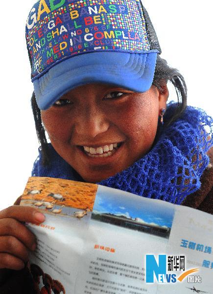 4月26日,手拿玉樹機場宣傳單、就要登機的才仁求吉小朋友非常興奮。當日,青海省玉樹縣少兒福利院21名孤兒乘坐飛機赴西寧市。他們將開始在那里的學習生活。 新華社記者陶明攝