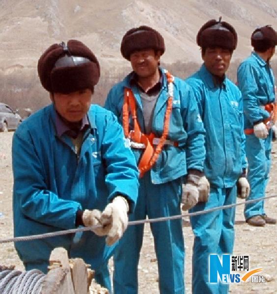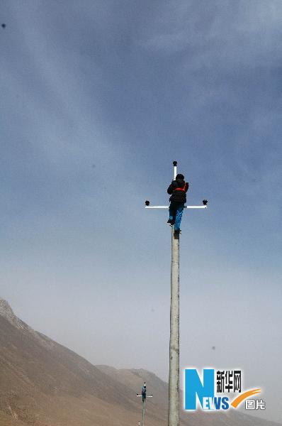 在上桿作業(yè),留下的只是背影(4月18日攝)。 流星的永恒,是它曾以熾烈燃燒的生命照亮夜空。 42歲的杜金玉,就是這樣一顆流星。這個(gè)憨厚、老實(shí)、平凡,一輩子沒有離開過青藏高原的送電工人,在2010年春天驟然黑暗的玉樹之夜匆匆劃過……他的生命之火就這樣靜靜地熄滅了,為這片災(zāi)難中新生的土地留下了燈火輝煌的一片光明。新華社發(fā)(何青 攝) 》》》詳細(xì)