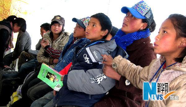 4月26日,玉樹縣少兒福利院的孩子們在玉樹機場查看機場登機信息。當日,青海省玉樹縣少兒福利院21名孤兒乘坐飛機赴西寧市。他們將開始在那里的學習生活。 新華社記者陳鋼攝