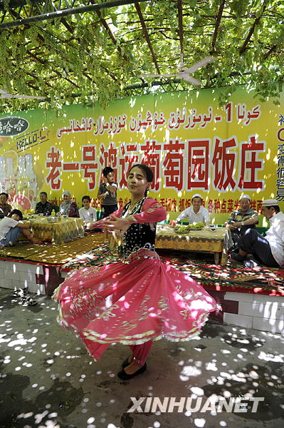 7月22日,新疆吐魯番葡萄溝的維吾爾族村民為來自西安的游客表演舞蹈。新華社記者戴旭明攝