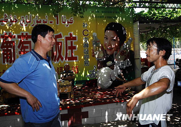 7月22日,新疆吐魯番葡萄溝的維吾爾族村民和來自西安的游客一起跳“麥西來甫”(一種傳統的維吾爾族歌舞形式)。著名旅游景區新疆吐魯番葡萄溝的維吾爾族村民載歌載舞,歡迎來自各地的游客。新華社記者戴旭明攝