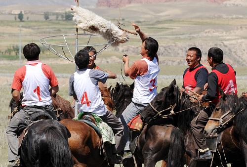 在叼羊比賽中,把羊扔進“鍋”中的隊伍可得到1分(8月16日攝)。新華社發(江文耀 攝)