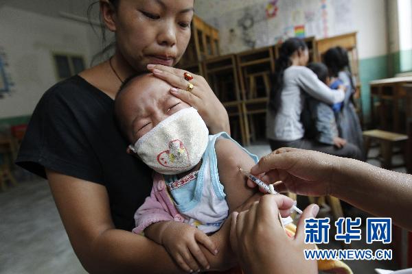 8月18日,在甘肅舟曲縣城獨立中學受災群眾安置點,醫務人員在為幼兒接種甲肝疫苗。鑒于舟曲災區目前的衛生和疾病預防形勢,甘肅省、甘南藏族自治州、舟曲縣三級疾控中心自8月16日開始,為災區1歲半至6歲的幼兒大面積接種甲肝疫苗,防止甲肝疾病的發生。截至8月18日12時,已有約500名幼兒接種了甲肝疫苗。新華社記者 任正來 攝