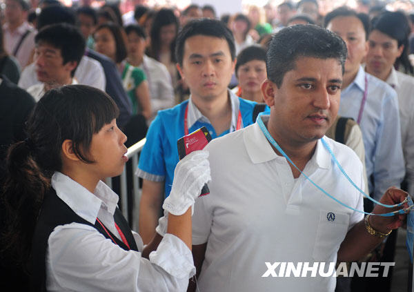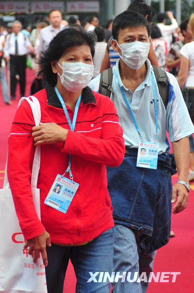 當日,第105屆廣交會第三期展會拉開帷幕,為嚴防甲型H1N1流感,參會人員進場前一律先測體溫。新華社記者 盧漢欣 攝