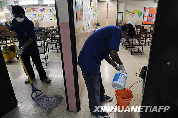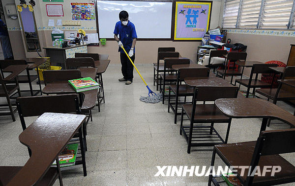 5月13日,在巴拿馬首都巴拿馬城,工作人員在一所學校的教室里擦地并消毒。當天,巴拿馬新增4例甲型H1N1流感確診病例。新華社/法新