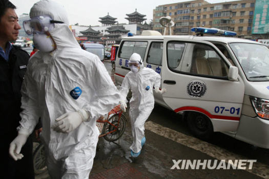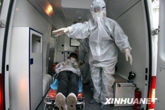 5月14日,安徽阜陽市潁州區衛生局在該區康復醫院舉行防控甲型H1N1流感醫療救治演練,以檢驗和提高醫務人員醫療救治水平和轉送重點傳染病病人的實戰能力。演練內容包括疫情收集報告、現場流行病學調查、病人采樣送檢、疫源地消毒等。新華社發(戴文學 攝)