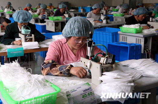 5月13日,在江蘇省泰州市海陵區九龍鎮一家醫用制品企業,工人正在按國家統一標準生產口罩。甲型H1N1流感疫情讓口罩成為俏銷貨,泰州企業在滿負荷生產的同時,嚴格操作流程,按國家統一標準生產,并落實質量分級承包責任制,嚴禁劣質口罩流入市場。新華社發(顧俊 攝)