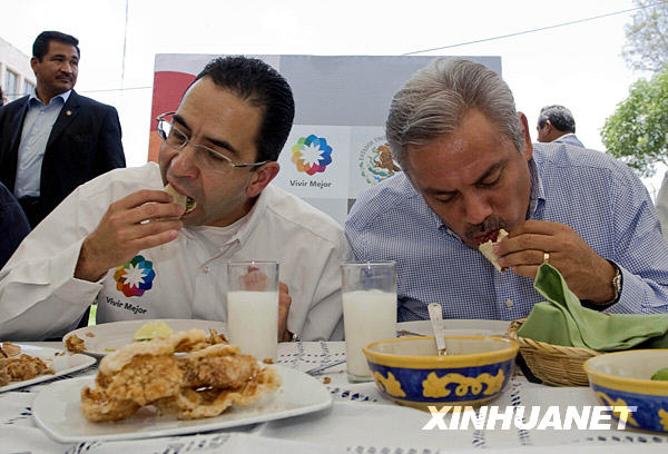 5月14日,在墨西哥首都墨西哥城,墨勞工和社會(huì)福利部長(zhǎng)阿拉爾孔(左)與農(nóng)牧漁業(yè)、鄉(xiāng)村發(fā)展部長(zhǎng)希門(mén)尼斯在新聞發(fā)布會(huì)上帶頭食用玉米餅卷豬肉。墨西哥勞工部在當(dāng)天舉行的新聞發(fā)布會(huì)上表示,吃豬肉或者豬肉制品是安全的,不會(huì)有感染甲型H1N1流感的風(fēng)險(xiǎn)。目前墨西哥市場(chǎng)上豬肉價(jià)格穩(wěn)定,銷(xiāo)售情況良好。新華社發(fā)(戴維攝)