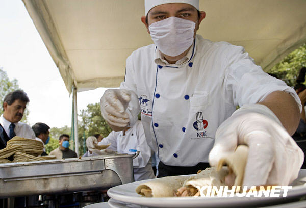 5月14日,在墨西哥首都墨西哥城舉行的新聞發(fā)布會(huì)上,廚師在制作玉米餅卷豬肉。墨西哥勞工部在當(dāng)天舉行的新聞發(fā)布會(huì)上表示,吃豬肉或者豬肉制品是安全的,不會(huì)有感染甲型H1N1流感的風(fēng)險(xiǎn)。目前墨西哥市場(chǎng)上豬肉價(jià)格穩(wěn)定,銷(xiāo)售情況良好。新華社發(fā)(戴維攝)