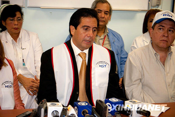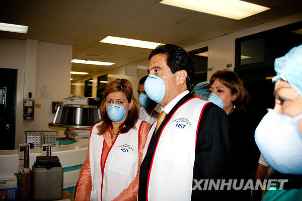 5月14日,巴拿馬總統(tǒng)馬丁·托里霍斯(中)在衛(wèi)生部長(zhǎng)羅薩里奧·圖爾納(左)的陪同下視察收治甲型H1N1流感患者的巴拿馬城圣托馬斯醫(yī)院。馬丁·托里霍斯在隨后召開的新聞發(fā)布會(huì)上承諾加大力度防控甲型H1N1流感。截至北京時(shí)間5月15日9時(shí),巴拿馬公布的該國甲型H1N1流感確診病例達(dá)39例。新華社發(fā)(韓碩攝)