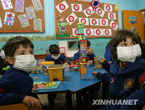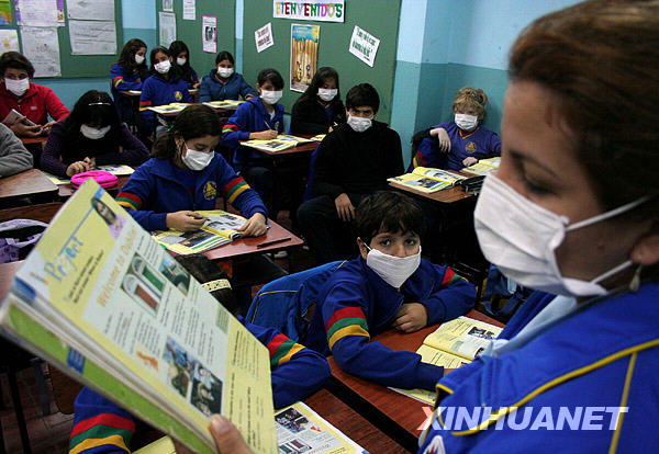 5月29日,在巴拉圭首都亞松森的一所學校內,學生戴著口罩上課。巴拉圭公共衛生部28日宣布,該國已經確診了5例甲型H1N1流感病例。新華社發(烏巴爾多·岡薩雷斯攝)