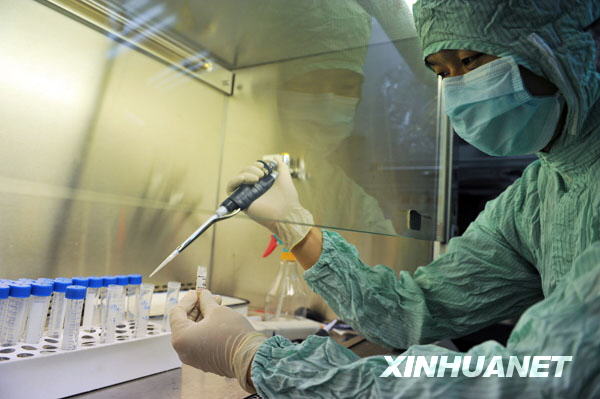 當日,由衛生部批準、經由世界衛生組織提供的6支甲型H1N1流感疫苗生產用毒株運抵武漢生物制品研究所,并于當天上午在該所實驗室進行擴增培養。7月底,將生產出疫苗原液,經過動物實驗和臨床I、II期實驗后,國慶節前有望生產出疫苗。新華社發(周超 攝)