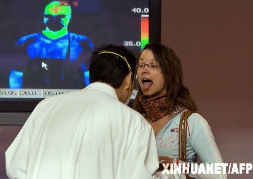 2009年5月5日 墨西哥已確診甲型H1N1流感患者人數(shù)增至776人 5月4日,在墨西哥首都墨西哥城的貝尼托華雷斯國際機場,一名墨西哥乘客接受健康檢查。墨西哥政府當日晚宣布,墨全國已確診甲型H1N1流感患者人數(shù)776人,死亡26人。新華社/法新