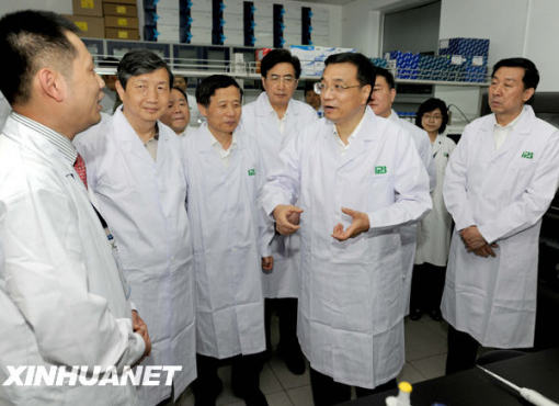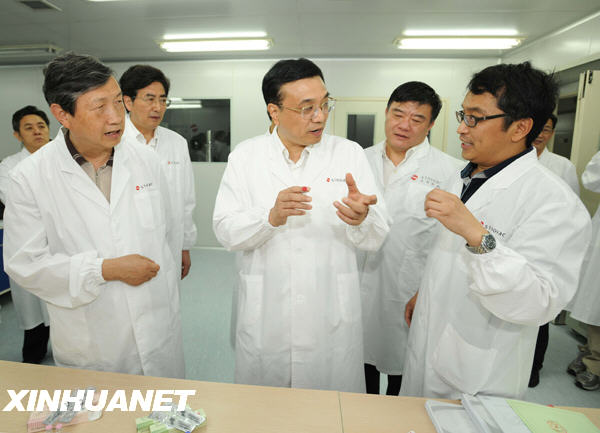 5月29日,中共中央政治局常委、國務院副總理李克強到中國醫學科學院和北京科興生物制品有限公司考察甲型H1N1流感防控工作,對聯防聯控工作作進一步部署。這是李克強考察北京科興生物制品有限公司,了解疫苗和藥品研制生產情況。新華社記者 馬占成 攝