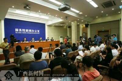 陳武利用數據向媒體介紹了廣西經濟社會發展情況。他說,廣西沿海、沿邊、沿江,是我國西南地區出海大通道,是我國與東盟開放合作的前沿、門戶和橋頭堡。全區轄14個地級市、109個縣、市、區,其中有12個民族自治縣,58個民族鄉,共有壯、漢、瑤、苗、侗等12個世居民族。2008年,廣西生產總值7172億元,在全國排第17位,比1950年增長了近120倍;人均生產總值14966元,比1950年增長近43倍。