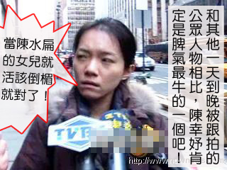 陳幸妤昨日更是容忍護衛隊隨意以媒體攝影鏡頭“拍女人的下面”為由,朝守候的記者吐口水,令人不禁想起陳幸妤數度與媒體交惡的場景。臺灣“今日新聞”昨天在其網站掛出陳幸妤歷次與媒體交惡畫面,并配以非常“形象”的設計旁白,令人對陳幸妤喜歡“發飆”的性格有了更深了解。(羅煜明)