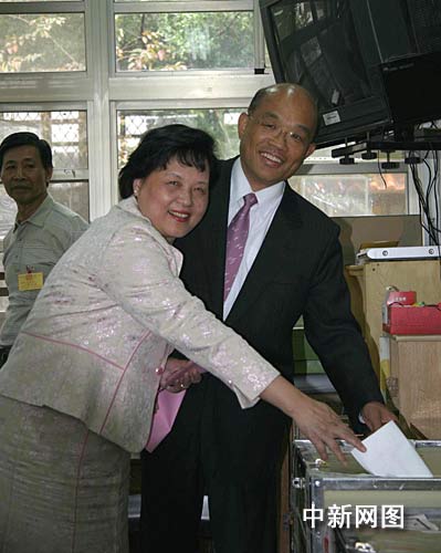民進黨臺灣地區副領導人候選人蘇貞昌與夫人二十二日上午一同投票。