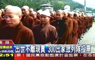 據臺灣媒體報道,10多輛大型游覽車,載著中臺禪寺的300多名和尚、尼姑,一同抵達投票所。300多人列隊整齊排在投票所外等候。