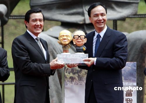 資料圖:2008年4月5日,馬英九為全臺最大的蔣中正銅像舉行再造重生揭幕,桃園縣長朱立倫(右)贈與“兩蔣”Q版公仔。 中新社發 杜洋 攝