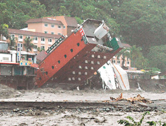 昨天中午11時38分,有22年歷史的金帥飯店,不敵激濁的山洪,在對岸圍觀群眾驚叫聲中,瞬間倒入知本溪中,附近十棟民宅與商店也被沖走;海岸山脈另一頭的紅葉溫泉全部被埋在泥石流里。